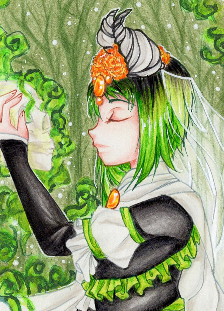 Fitting elements: get creative! There is nothing specific in mind for her yet as she is quite mysterious in general. Feel free to draw her a bit more on the creepy spectrum of things if you'd like